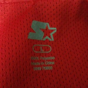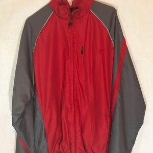 Red and grey with some white piping has zipper pockets on sides with pull draw strings on bottom of jacket like brand new