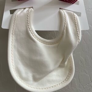 Charming bib set by Starting Out. Features a Christmas tree design. Includes cream and red colors. Ideal for festive occasions. Purchased at Dillards.