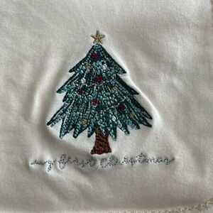 Cozy cream blanket purchased at Dillards, featuring a festive embroidered tree and embroidered my first Christmas on it. Perfect for holiday warmth.