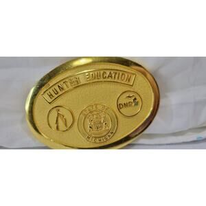 State Of Michigan Hunter Education Gold Belt Buckle. 3"L x 2"W. Shiny with just a bit of markings around the edge. Please ask any questions before purchase.