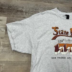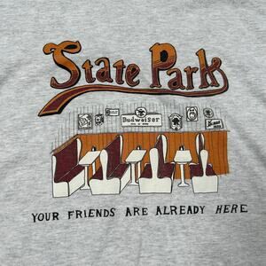 Heather gray Gildan Ultra Cotton graphic tee with retro diner booth print and "State Park – Your Friends Are Already Here" slogan. Features Budweiser and bar wall art motif. Tag size XL—fits true. Great condition with no flaws. Soft, easy staple with laid-back vibes.
