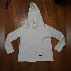 This hoodie is super soft on the inside! I love the speckled colors on this off white Polyester/Cotton blend material. Raw hems on the sleeves and bottom.