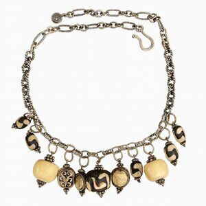 Make a bold statement with this stunning handcrafted African Batik Bone Necklace. Featuring large, hand-carved batik bone beads in rich ivory and brown tones, each bead is unique—created using the traditional wax-resist dye technique. The necklace is accented with intricate silver-tone metal spacers and a textured chain, giving it a refined, artisan look.