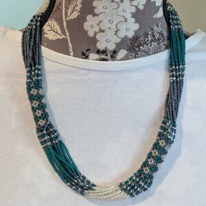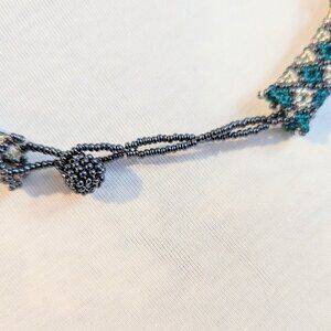 This one-of-a-kind turquoise, clear, and dark gray beaded Artisan made Statement necklace is sure to be admired. The vintage piece features a cluster style with a beaded hook mechanism closure, measuring 22 inches in length. Handcrafted with beautiful interwoven colors, this necklace exudes beauty and artistry, perfect for adding a unique touch to any outfit. This necklace exudes quality and is a stylish accessory for women who appreciate artisan crafted jewelry.