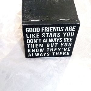 Small box with hinges. It says, "Good friends are like stars, you don't always see them, but you know they're always there". The box is rustic, and has a place for your finger to open the top- comes from a smoke and pet free home.