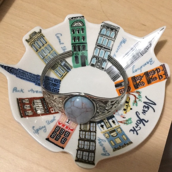 This bangle has beautiful detail- it is silver with a dusty blue stone in the center, as well as floral detail on the sides.