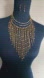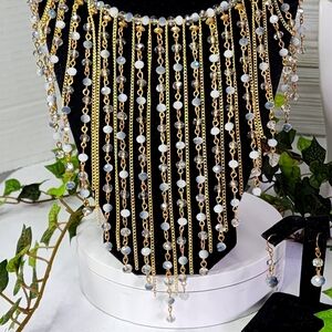 Choker-style with multiple strands of beads and chains cascading in a waterfall design