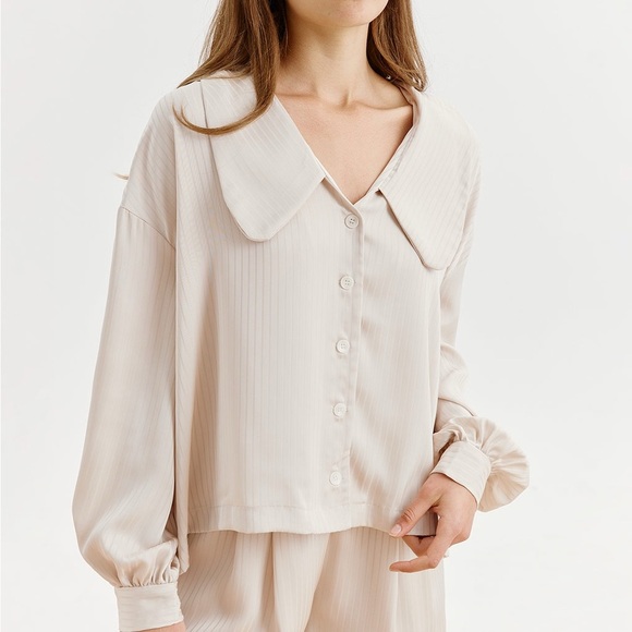 Elevate your loungewear with this chic Statement Collar Cropped Pajama Set by Nap Loungewear. This set includes the cropped, collared top and matching striped pants, combining luxury and comfort.