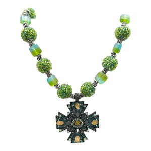 Statement Cross Pendant Ball Beaded Necklace Green Toggle Closure Vintage