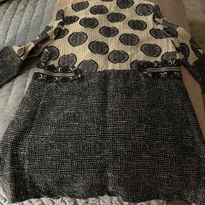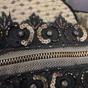 This coat is from Italian maker Save the Queen. Size Large. It is a beautifully embellished coat that may be worn over pants, skirt or a dress. It will turn any piece into a smashing outfit. It is navy and cream. It was worn once to a fundraising fashion show over navy flow pants.