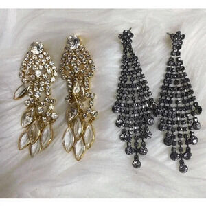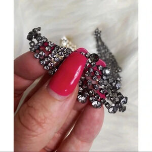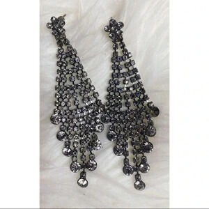 - dark diamond/gunmetal chandelier earrings. Missing one diamond (see last pic). Flower shape at top of earring.
