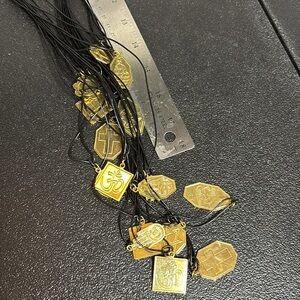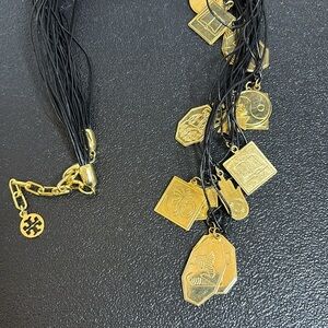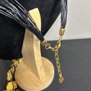 This stunning multi-strand necklace features elegant black cords adorned with gold-tone charms. Perfect for adding a touch of sophistication to any outfit.