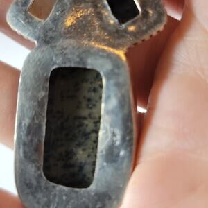 This captivating artisan pendant showcases a large rectangular dendritic jasper cabochon, featuring mesmerizing natural fern-like inclusions. A golden Baltic amber dome, a deep purple sugilite accent, and a luminous square-cut moonstone enhance its allure. Each exquisite gem is carefully bezel-set in textured 925 sterling silver, creating a harmonious blend of earthy, mystical, and glowing tones. This pendant includes a complimentary 20-inch sterling silver snake chain. A truly unique treasure for discerning gemstone collectors and lovers of statement jewelry. Add a touch of artistry and elegance to your collection with this exceptional piece!