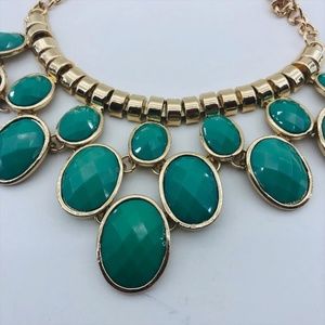 Statement green stone gold tone chain necklace. This very pretty necklace is a perfect accessory for those Summer outfits. Gold tone chain and setting, with faceted green stones. Lobster clasp. The necklace length is adjustable. From smoke/pet-free home. Please feel free to ask if you have any questions.