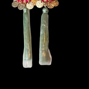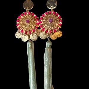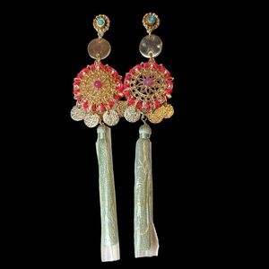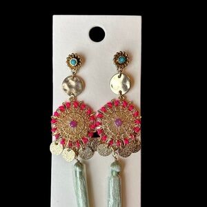 ON TREND DOR SPRING SUMMER 2024 is big bold statement jewelry! It’s time to have fun with statement pieces that can make and or change the feel of an outfit! These post pierced earrings from Express have a boho gypsy tropical hippy feel that works perfectly for a pop of color to the basic color trends of black and white for spring summer 2024 or always looks great with denim! These earrings have a gold filigree base with gold charms and colorful beads that blend perfectly with the light green long fringe bottom. Colors include gold pink green and turquoise blue. The fringe is wrapped in a plastic cover to protect them from fraying. Medallion base is aprox 1” in diameter and the over length is aprox 4 1/2”. NWT