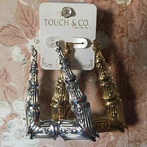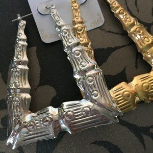 Big chunky over sized ear-rings, both large stylized faux bamboo in a rectangular hoop. One is silver tone, one is gold tone metal so they both go with EVERYTHING. Hollow so not as heavy as they look. New unworn, super posh look!