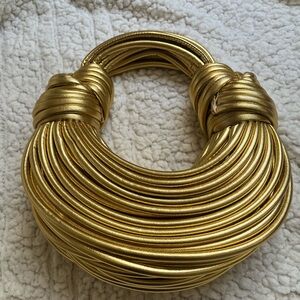Bold multi-strand bag in metallic gold. Thick wrapped cords create a sculptural, layered look. Secure knotted detailing at the sides. Eye-catching, modern statement piece for a night out. ✨