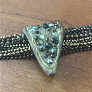 This exquisite Vintage Micki Ravitz signed handcrafted necklace showcases a sophisticated blend of gold and earth tone metals, featuring an intricate woven design that creates a striking statement piece. The V-shaped pendant adds a touch of elegance, making it perfect for evening wear. Its substantial collar style ensures it stands out, adding a unique flair to any ensemble!