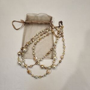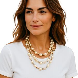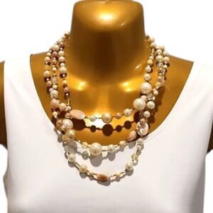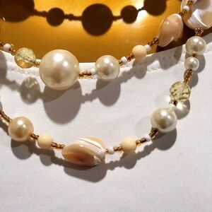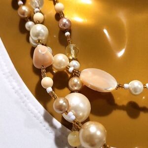 Elegant beaded and faux pearl necklace. 3 gold strands of beads in white, ivory, pale beige, light coral/peach, and gold. Measures approximately 20 inches when full extended.