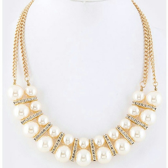 Here's a Gold, pearl, and rhinestone statement necklace to dress up your business casual or last minute date night look.
