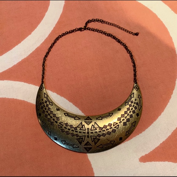 Muted gold crescent with arrows and triangles carved into it. Perfect for parties and as a statement piece! I wore it as an Egyptian queen for Halloween. It can be worn as a choker or longer - the chain is adjustable between 9” and 13.5 inches.