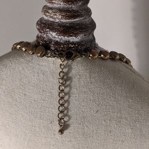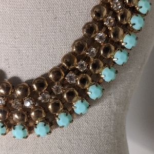 Pretty collar necklace with brass, white crystal, and mint gemstone accents! Great for work!