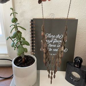 This gold statement necklace is in good used condition. There is some tarnishing from wear but there are no missing links. It’s adjustable to sit high on the neck like a collar necklace or it can hang lower. It’s super pretty and fun and ads immediate interest to any cocktail dress or can even dress up a more casual outfit.