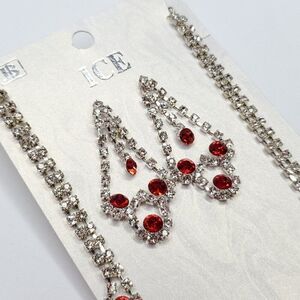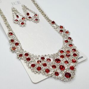 Statement Necklace Earring Set Rhinestones Clear Red Silvertone Prom Party