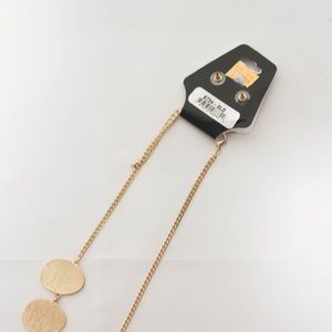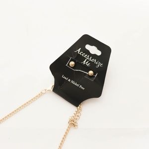 - Gold stud earrings and gold statement necklace with soft faux leather embellishments and gold hardware.