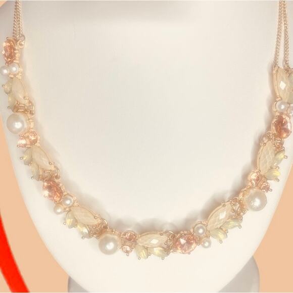 Statement Necklace Faux Pearls, Peach and White Crystals 16” w/ 4” ext