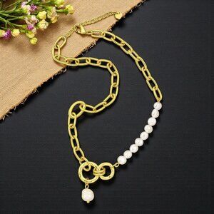 Make a bold yet elegant statement with this stunning necklace featuring a chic mix of genuine freshwater pearls and gleaming 18K gold plated stainless steel links. β¨ The unique design combines classic sophistication with a trendy modern edge, perfect for turning heads wherever you go. One side showcases lustrous freshwater pearls, while the other features polished chain links, both meeting at textured gold circles that hold a dangling pearl charm. This necklace effortlessly bridges timeless and contemporary fashion, making it your next go-to piece for any outfit. π