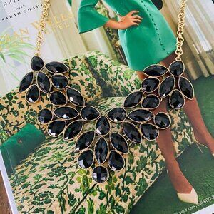 Make a statement in this lovely black statement necklace. Black faceted crystals in marquise and round shapes. Goldtone chain.