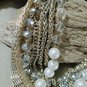 Statement Necklace Multi 8 Strand Glass Crystals Faux Pearls Gold Silver Chunky