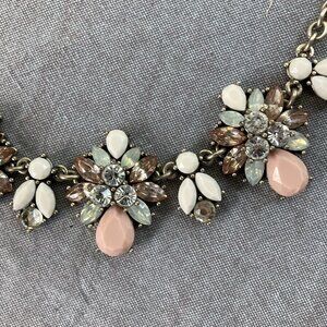 Turn heads, drop jaws, and possibly blind your enemies with this fabulously extra retro-style necklace. Featuring oversized floral clusters of pale teardrops, ivory marquise stones, golden sparkle petals, and rhinestones that say “I’m not here to blend in”, this necklace is here to make you the main character.