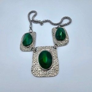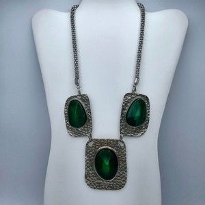 Green Gem Statement Necklace Hammered Silvertone Metal 18" - 20". Largest Pendant is 2" x 2 1/2 inches. See pics for wear on acrylic gems. In good pre-ownes condition. The cover photo is the best representation of the color. The gems are a rich green.