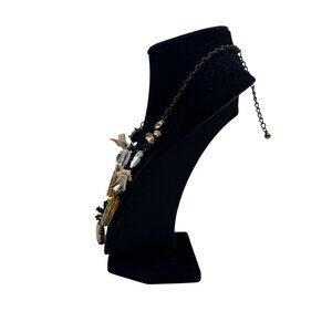 This necklace combines amber and clear beads with delicate butterfly charms for a refined aesthetic. Finished with a pearl accent and antique bronze chain.