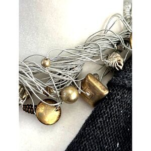 Add some bold flair to your outfit with this striking statement necklace. Featuring a chaotic yet captivating web of silver-tone threads, this piece is adorned with an assortment of metallic beads and textured elements. The mix of gold and brass-toned accents gives it a unique, industrial vibe. Perfect for adding edge to a simple black dress or layering with other jewelry for a boho-inspired look. Ideal for those who love eye-catching, artistic designs.