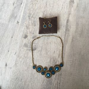 Statement Necklace/Earrings Sparkling Blue Set in rustic gold finish hardware. Excellent condition, worn once, and makes great statement pieces! Glows and shines!!