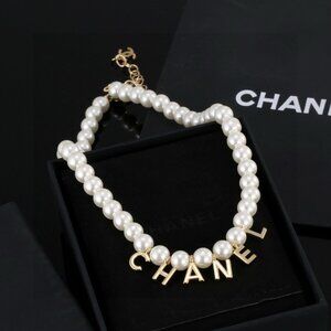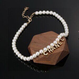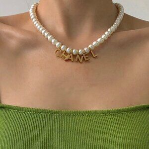 Make a statement with this stunning faux pearl necklace, showcasing an elegantly designed interlocking monogram charm, a beautiful blend of tradition and contemporary allure.