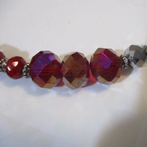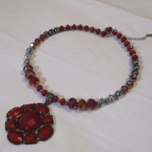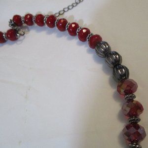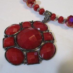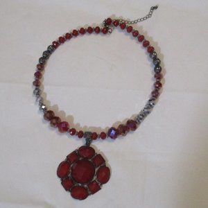 Faceted cabochon pendant on beaded choker - faceted aurora borealis red glass rondel beads, silver faceted rondel beads, silver melon beads, faceted red acrylic rondel beads and silver spacers. Adjustable with lobster claw clasp