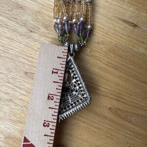 Add a touch of elegance to your outfit with this stunning hand made statement necklace. The necklace features a beautiful combination of purple amethyst, orange citrine, green peridot gem stone beads with a baroque pearl and topaz gem in the pendant. The necklace is a perfect accessory for any occasion, including Mother's Day, Christmas, anniversaries, birthdays, and Valentine's Day. This 16" artisan crafted pendant necklace is purity hallmarked 925 sterling silver mark weighs 100.4 grams precious metal and gems. Very high quality made by an expert jeweler we found similar pendant necklaces but none like this one so likely one of a kind. This necklace is in Excellent to Like New pre owned clean condition, all original stones, lobster clasp functions properly, well maintained from a wealthy Southlake Texas estate collection. Please review pictures for more details and size measurement information, thank you.