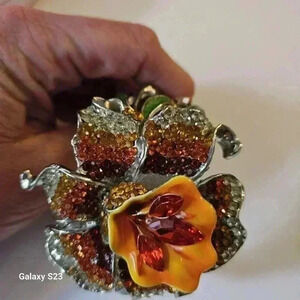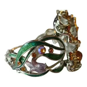 Larger Marquise Shaped Crystals in Darker Orange Color in Center . Enameled leaves on Sides with Auroura Borealis Color Crystal. Lavender Enameled Tulips on Sides.