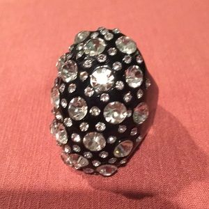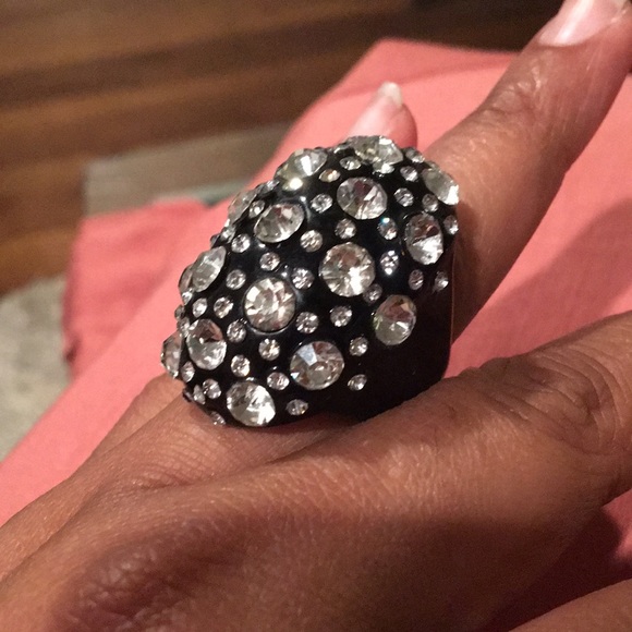 BLING,BLING to this fashion statement ring!!!! Not sure of the size....If I had to guess, I would have to say about a size 8. Lots of sparkle and none of the stones are missing. Light scratches to the side of the ring but noting noticeable at all!
