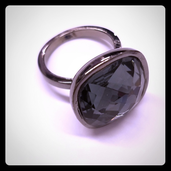 This statement ring is in a gunmetal band with a large rounded square cut grey stone.