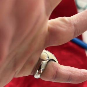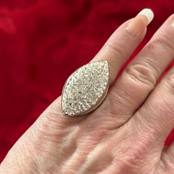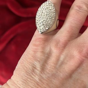This ring has enamel sides with rhinestones on top. Size 5 1/2. From top to bottom it measures 1.25 inches and side to side it’s .75 inches. Note the decoration does not go all the way around - see pictures. Make me an offer!!