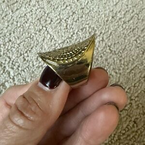 Make a bold statement with this elegant gold ring. Perfect for adding a touch of sophistication to any outfit.