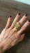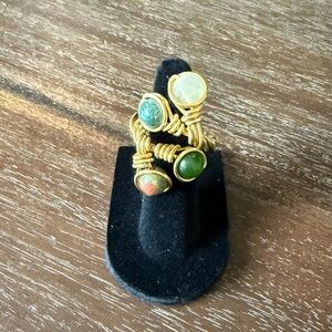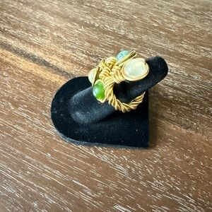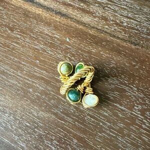 This elegant ring features stunning green stones wrapped in a luxurious gold finish. Perfect for adding a touch of sophistication to any outfit.