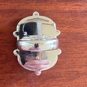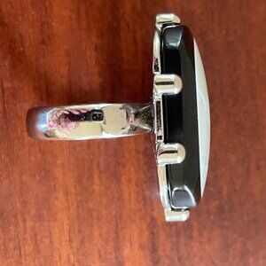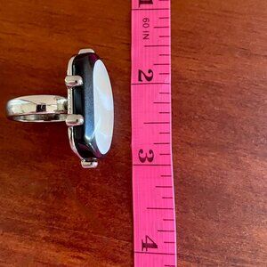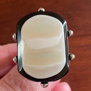 Large statement ring featuring a silver-tone band with a large white stone-like centerpiece. Iridescent. The focal piece is smooth, slightly convex, and measures about 1½″ long by ⅓″ thick. Framed in black for a striking contrast. Heavy and substantial with a modern yet timeless look. No maker’s marks. Sz 8