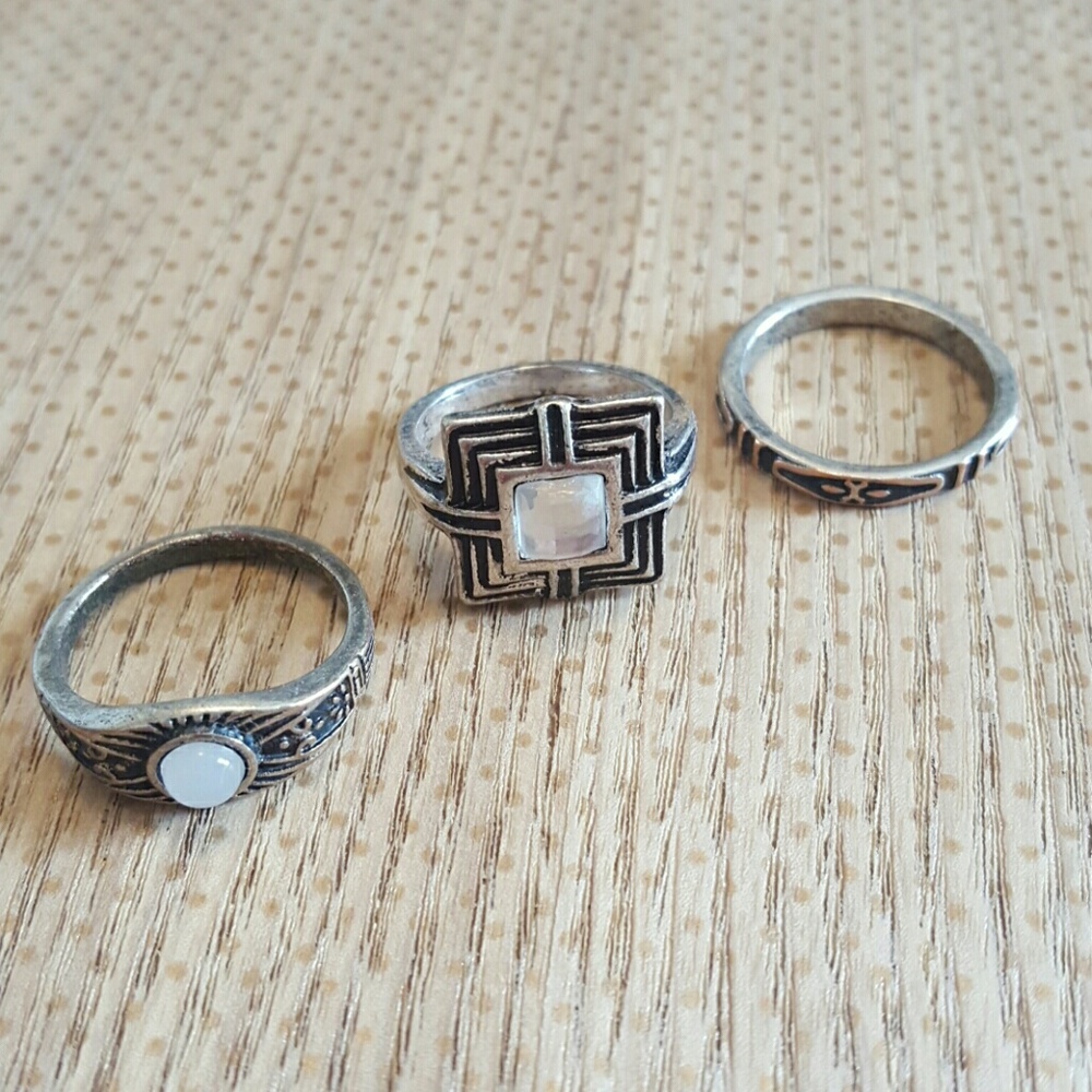 Set of three brushed silver statement rings with aztec details. Size 9.
