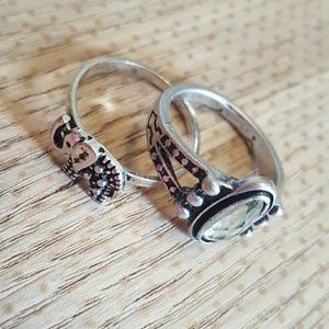 Set of two statement rings. One large rhinestone, the other an elephant, both in brushed silver. Size 9.